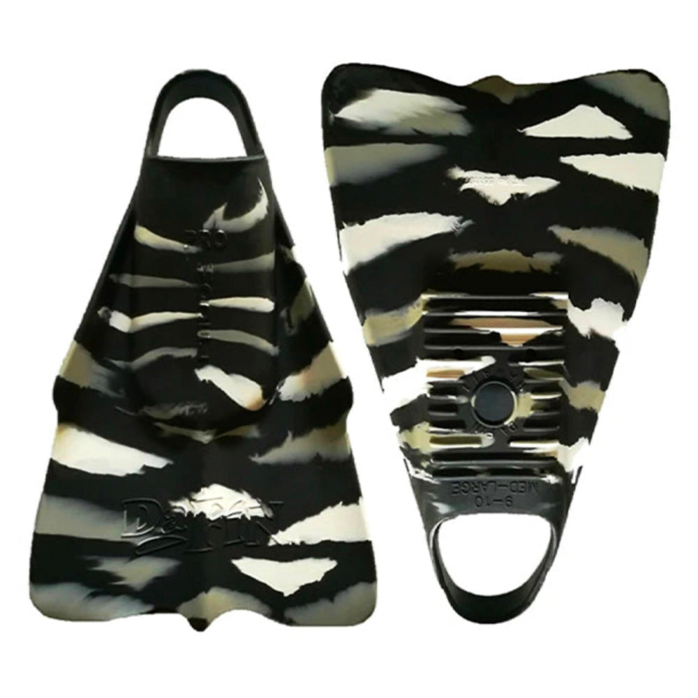 DaFin Zak Noyle body surfing fins in black white camo. Developed in Hawaii with input from world renowned pros such as Mark Cunningham and Brian Keaulana, DaFiN was granted a U.S. Patent for its original design. DaFiN combines unparalleled comfort with exacting construction to create a swim fin that performs under the most extreme conditions.