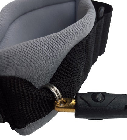 We took the original tight coil leash and removed 3 coils so the leash was not too long. Swivels are important so we included one at each end, one of which connects to a heavy duty metal loop. This loops helps the leash to have maximum movement so far less tangle and more freedom to paddle. Most metal loops will be held onto the leash strap by a string or a thin piece of webbing strap. By attaching directly to the strap webbing we get a far stronger fixing.